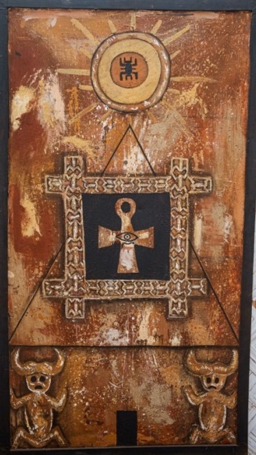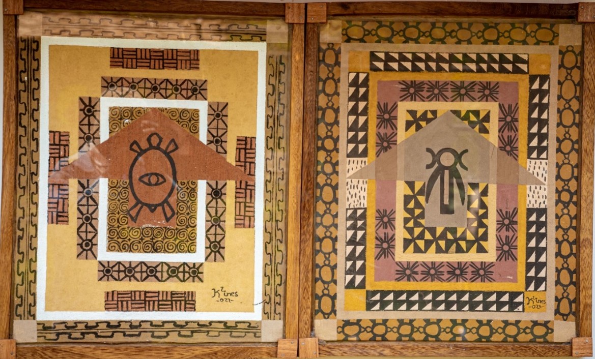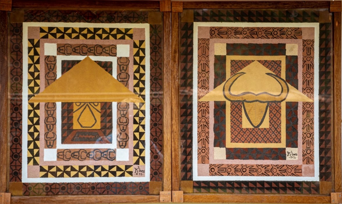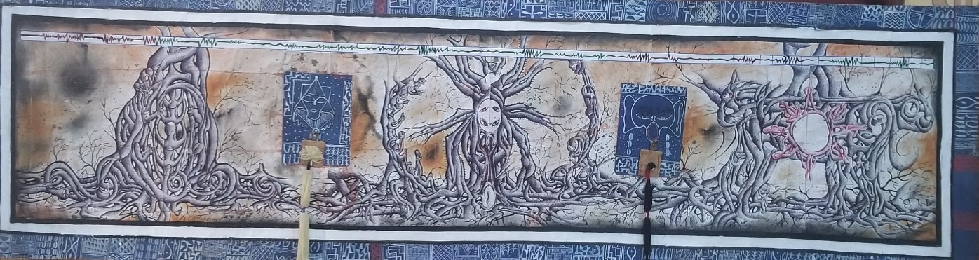 Dans son travail monté à base de pigments naturels (calcaire, argile, charbon et bien d’autres médiums, Ines Kendjio interpelle à l’initiation aux archétypes à travers la représentation plastique des signes et symboles Grassfields.