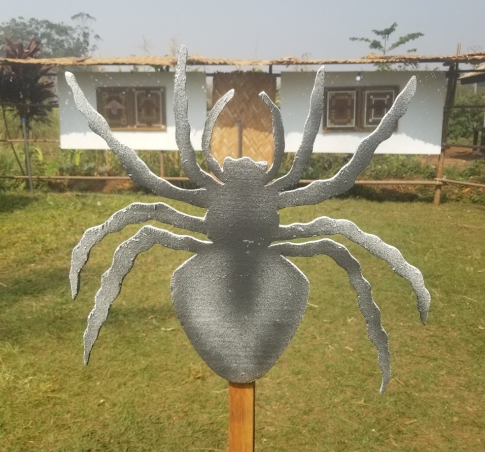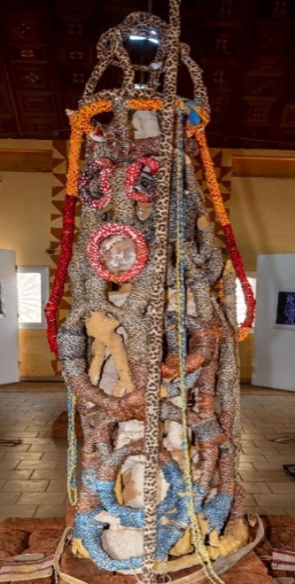 À l’entrée de l’exposition, une sculpture de Puteuh  (langue Yemba) « main droite », « lion » représentant le gardien et protecteur des lieux, à côté d’une ruche d’abeille Ngnwa’ symbole de l’écriture, de la mémoire et de la communauté, du vivre ensemble et donc du matriarcat africain, accueillaient le visiteur.