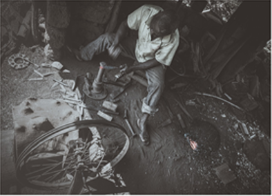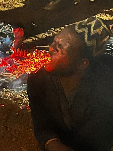 La Figure du Forgeron ou Talom était ainsi photographiquement représentée par l’artiste photographe Sidoine Yonta pour imaginer le réexamen symbolique des transmutations sociales. En tant que créateur des sens, des gestes, des matériaux et des éléments agissants dans la société, le talom est au fondement des sociétés grassfields.