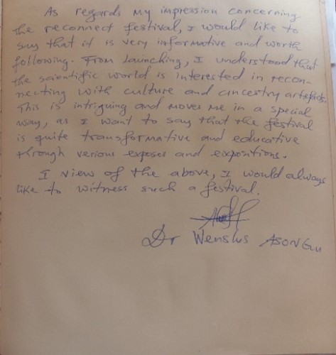 L’exposition/workshop « Reconnecter les objets, les savoirs et/avec les sujets » a été un moment de mise en commun des énergies des perspectives dans un sens de co-production des savoirs et des possibilités du futur. De la métaphore du vautour à l’entrée de l’exposition mise en scène à travers l’art plastique de Marios Kenfack, la transmutation et le travail créatif des différents artistes sur tout le parcours de l’exposition ainsi que les arts vivants à travers les performeurs (André Takou Sa’a, Natural Mystik, Tombé franklin, Hector Frandrin, ), ce moment de rencontre entre l’ art, la culture et la science a montré comment faire société et comment la synergie des actions est capable de faire un tout monde au sens de Felwine Sarr.