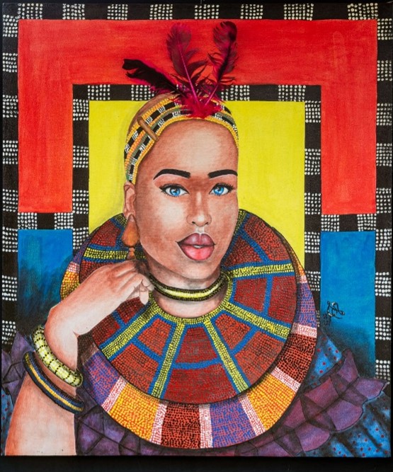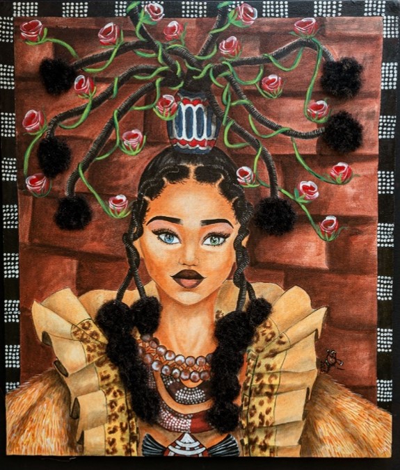 À l’image d’Anansi des mythologies Ashanti, elle incarne la connaissance profonde cachée derrière les signes, les symboles et les différents motifs de géométrie sacrée que représentent les coiffures. Elle introduit et centralise l’univers des archétypes et des  symboles plastiquement représentés par Ines Kendjio et les coiffures de Stévie Douanla.