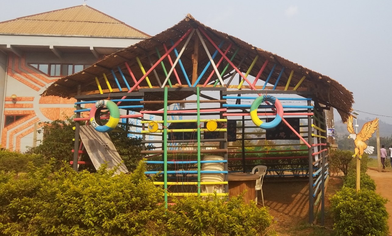 Emblème totémique de la Menoua, l’aigle trônait aux cimes de la reconnexion. Visionnaire, il s’appuyait sur la case des enfants en bambou de raphia aux couleurs contemporaines, mais au visage de masque d’éléphant symbole de la mémoire et de la transmission par l’expérience.